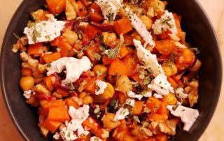 Sült édesburgonyás-csicseriborsó saláta